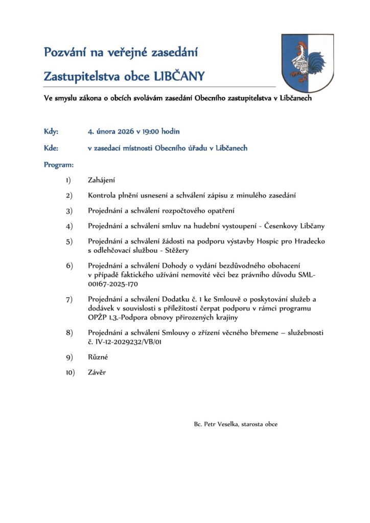 Pozvánka na veřejné zasedání zastupitelstva obce Libčany 4.2.2026