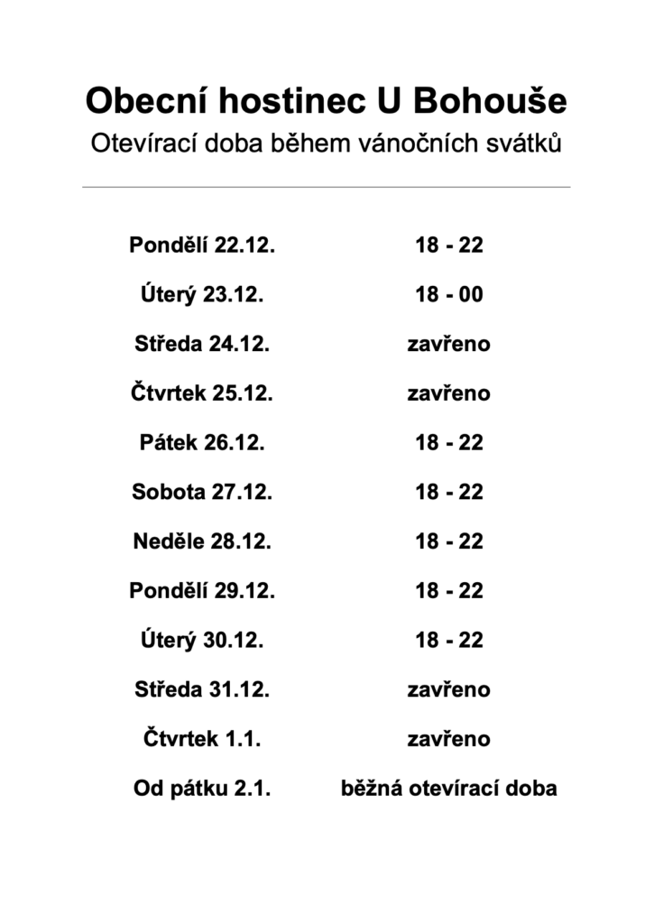 Od 19. do 22. října bude Obecní hostinec U Bohouše zavřen.