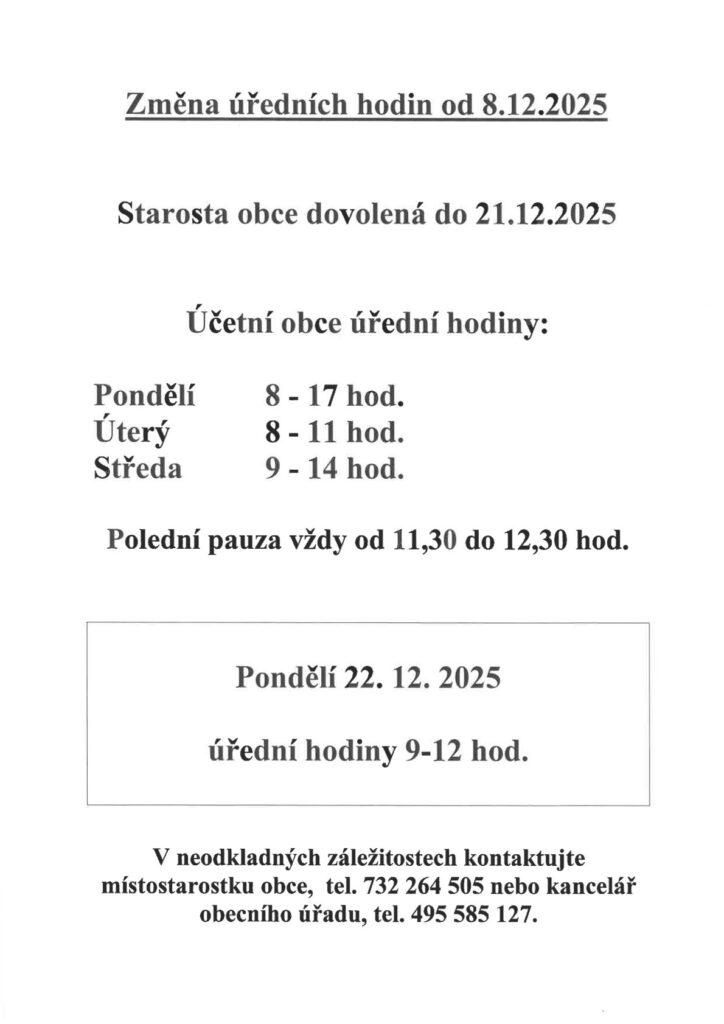 Tento pátek, 31.10.2025, bude změněna provozní doba na pobočce České pošty v Libčanech od 8:00 do 11:00 hod. Odpoledne bude zavřeno.