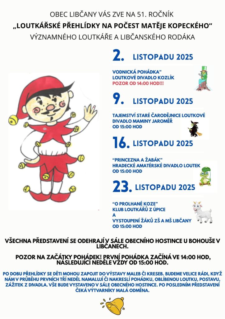 Čeká nás velmi pestrý víkend! Dnes půjdeme s nejmenšími libčaňáčky uspat broučky k zimnímu spánku, v sobotu nás už od rána čeká výlov rybníka Kočár a všechny rybí dobroty, na které si vzpomenete. V sobotu navečer si pak, kdo má objednáno, pochutná v obecním hostinci na výborné svatomartinské huse a v neděli zakončíme víkend krásným loutkovým představením, pohádkou “Tajemství staré čarodějnice”.