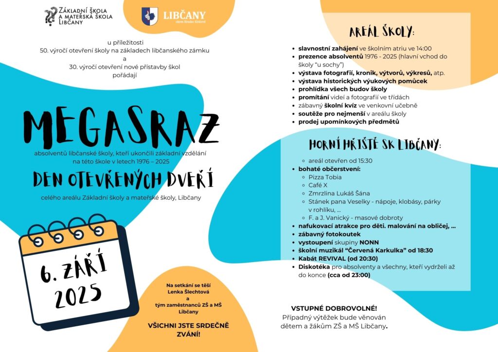 MEGASRAZ aneb 50. výročí otevření ZŠ a MŠ Libčany Domov / Udalosti / Tato událost skončila Datum 6. 9. 2025 Čas Celodenní událost