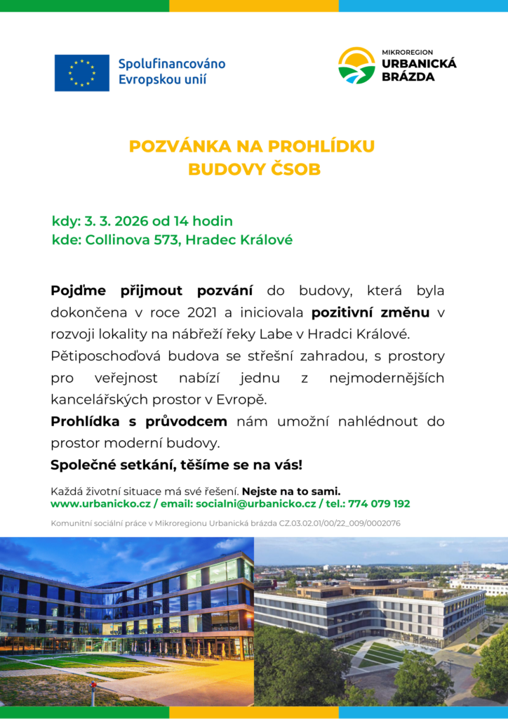 Pozvánka na prohlídku budovy ČSOB Domov / Udalosti / Datum 3. 3. 2026 Čas 14:00 POZOR!!! Počet míst je omezen. Nutná rezervace na tel: 774 079 192.